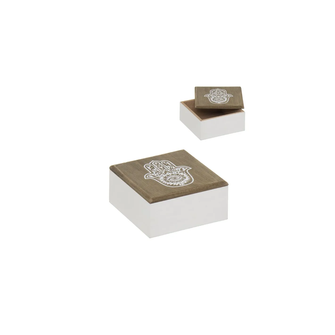 Descubre la elegancia y el simbolismo de nuestra caja de madera decorada con una mano de Hamsa. Este exquisito objeto no solo sirve como un hermoso elemento decorativo, sino que también representa protección y buena fortuna. Fabricada con materiales de alta calidad, su diseño artesanal garantiza durabilidad y un toque único a cualquier espacio. Ideal para guardar joyas, recuerdos o pequeños tesoros, esta caja es un regalo perfecto para quienes valoran la estética y la espiritualidad. Añade un toque de significado a tu hogar con esta pieza excepcional.