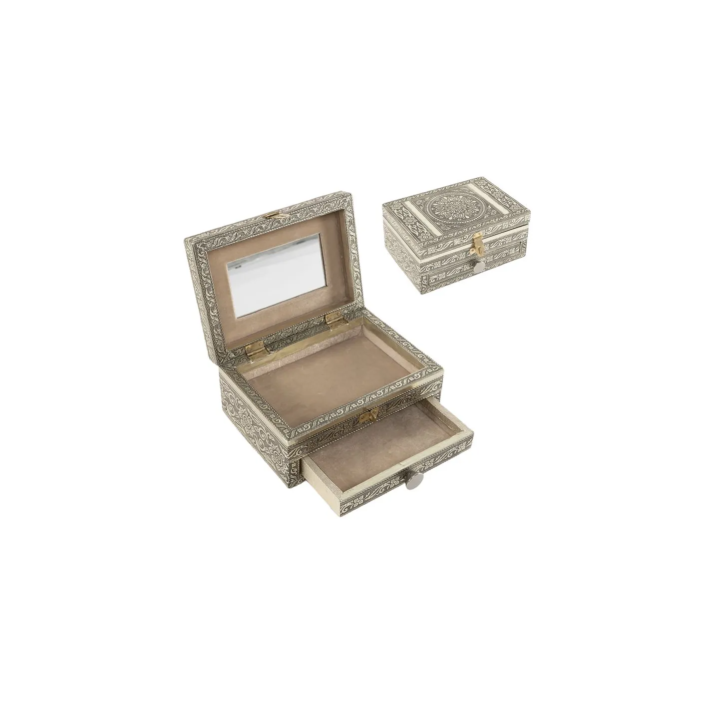 Descubra la elegancia atemporal con nuestro joyero de plata ornamentado, diseñado para resguardar sus tesoros más preciados. Este exquisito estuche no solo ofrece un espacio seguro para sus joyas, sino que también cuenta con un espejo interior que añade un toque de sofisticación y funcionalidad. Su acabado detallado y brillante realza cualquier decoración, convirtiéndolo en una pieza central en su tocador. Ideal para regalar o para consentirse, este joyero es la combinación perfecta de belleza y practicidad.