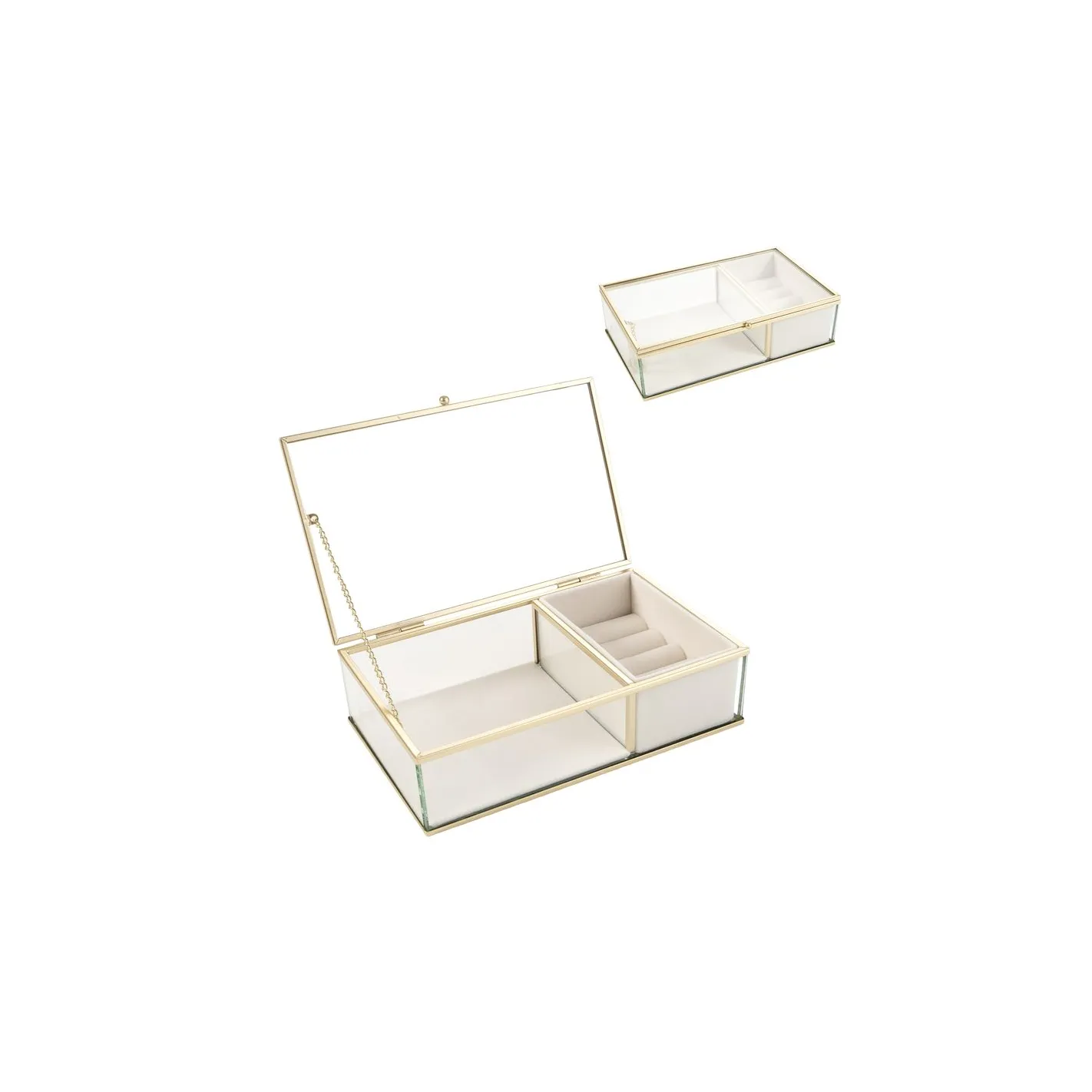 Descubre la elegancia y funcionalidad de nuestra caja de joyería de vidrio transparente, diseñada con dos compartimentos para mantener tus accesorios organizados y a la vista. Su diseño minimalista no solo resalta la belleza de tus joyas, sino que también se adapta a cualquier decoración, convirtiéndola en un elemento decorativo ideal para tu tocador. Perfecta para anillos, pendientes y collares, esta caja es la solución perfecta para quienes valoran tanto el estilo como la practicidad.
