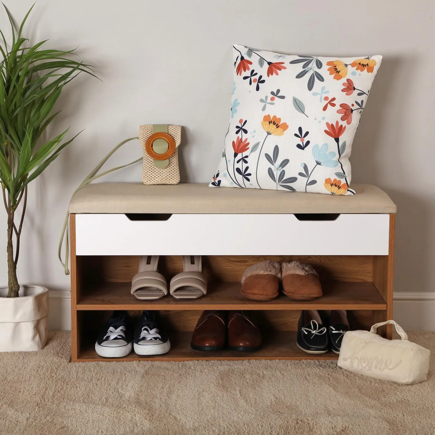 Descubre la elegancia y funcionalidad de nuestro banco de almacenamiento blanco y madera, diseñado para complementar cualquier espacio. Con un estante blanco que ofrece un lugar ideal para organizar tus objetos, este banco no solo es una solución práctica, sino también un elemento decorativo que aporta calidez y estilo a tu hogar. Perfecto para la entrada, la sala de estar o el dormitorio, su diseño versátil se adapta a tus necesidades, manteniendo todo en orden y al alcance de la mano. ¡Haz de tu hogar un lugar más acogedor y ordenado con este encantador banco de almacenamiento!