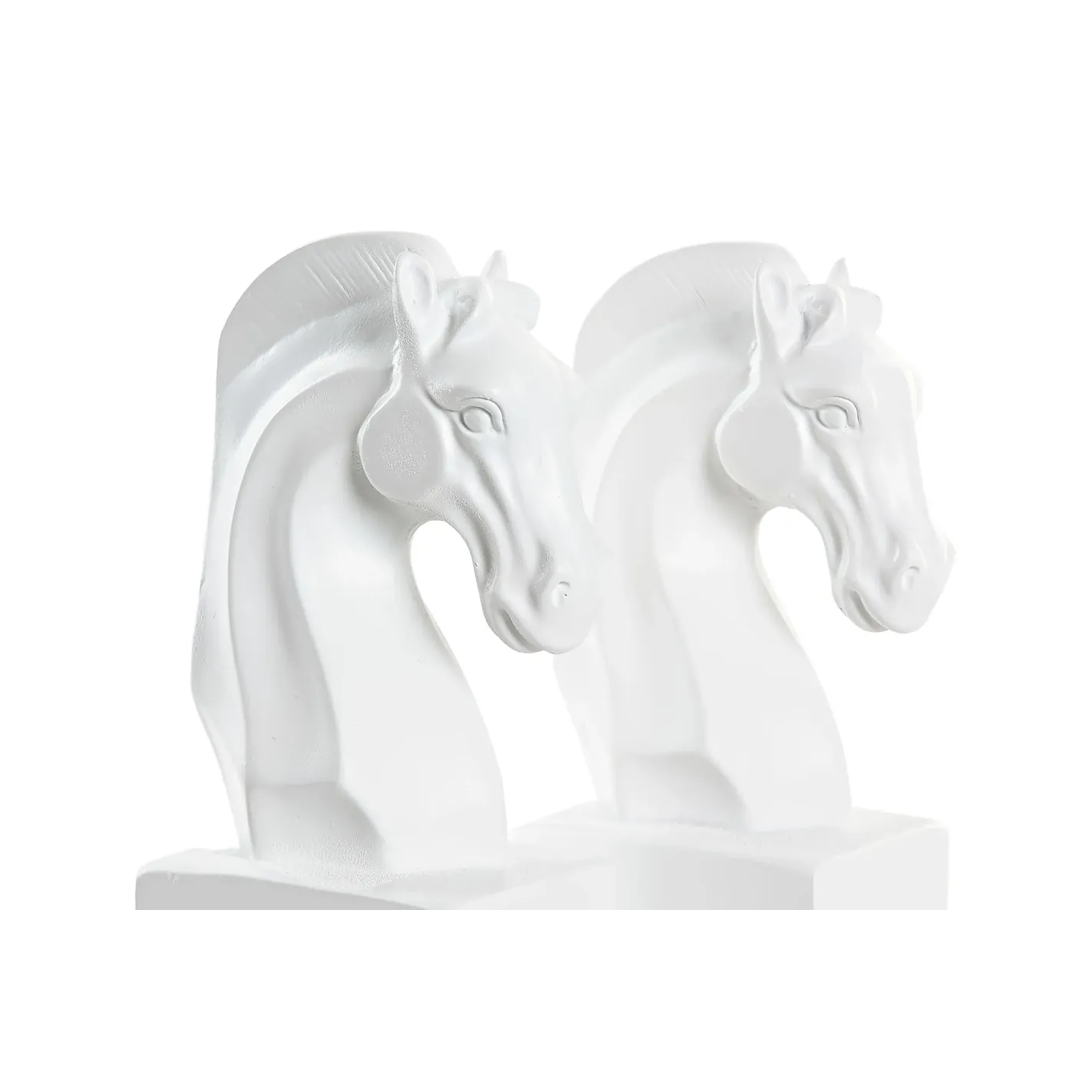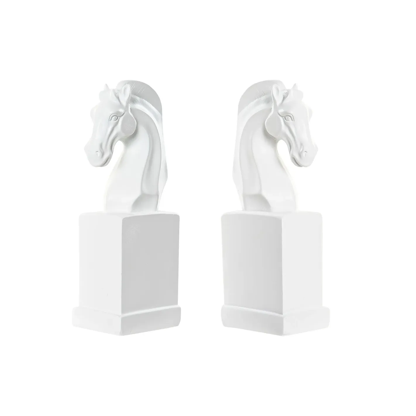 Descubre la elegancia y el arte en tu hogar con este par de esculturas de cabezas de caballo blancas, montadas sobre bloques blancos. Estas piezas decorativas no solo son un atractivo visual, sino que también funcionan como sujeta libros, aportando un toque sofisticado a tu estantería o escritorio. Perfectas para amantes de la equitación o del diseño contemporáneo, estas esculturas son el complemento ideal para cualquier espacio, fusionando funcionalidad y estilo en una sola obra.