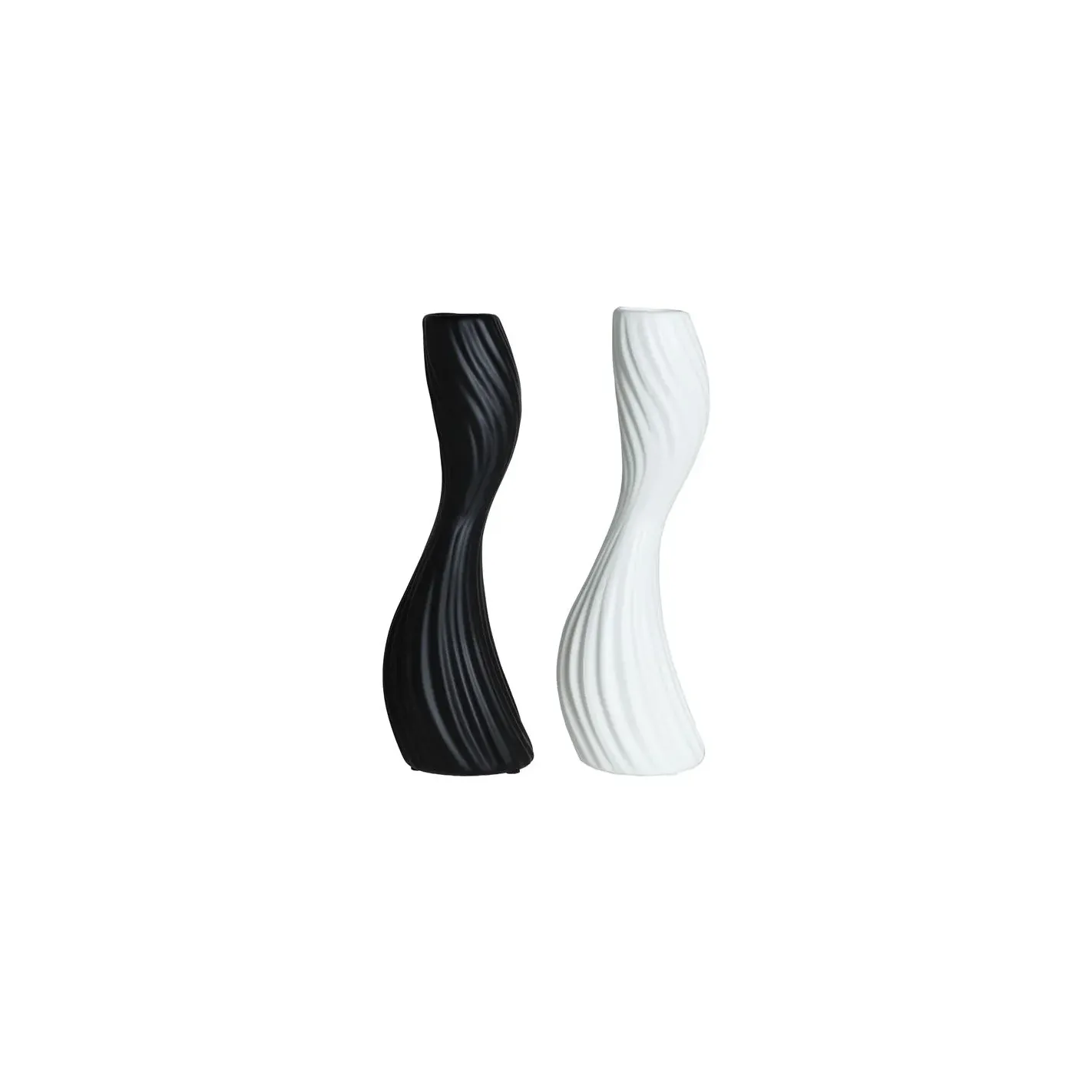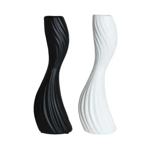Descubre la elegancia atemporal de nuestros jarrones en blanco y negro, diseñados con formas curvas que aportan un toque moderno a cualquier espacio. Estos jarrones no solo son piezas decorativas, sino que también son versátiles, perfectos para exhibir flores frescas o como elementos decorativos por sí solos. Su contraste de colores y su diseño fluido los convierten en el complemento ideal para realzar la estética de tu hogar u oficina. Añade un toque de sofisticación a tu decoración con estos jarrones únicos.