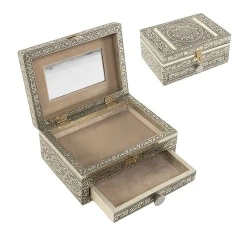 Descubra la elegancia atemporal con nuestro joyero de plata ornamentado, diseñado para resguardar sus tesoros más preciados. Este exquisito estuche no solo ofrece un espacio seguro para sus joyas, sino que también cuenta con un espejo interior que añade un toque de sofisticación y funcionalidad. Su acabado detallado y brillante realza cualquier decoración, convirtiéndolo en una pieza central en su tocador. Ideal para regalar o para consentirse, este joyero es la combinación perfecta de belleza y practicidad.