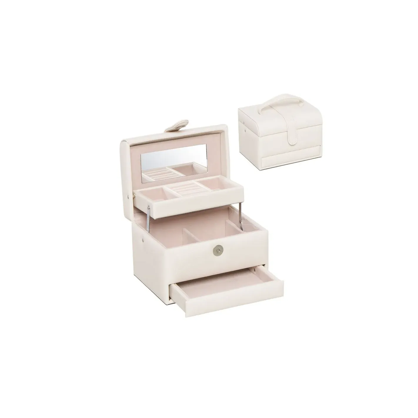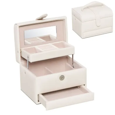 Descubre la elegancia y funcionalidad del Joyero, una exquisita caja de joyas blanca que cuenta con dos compartimentos diseñados para mantener tus accesorios organizados y al alcance de la mano. Su acabado pulido no solo resalta su belleza, sino que también protege tus piezas más preciadas del polvo y los enredos. Ideal para cualquier espacio, este joyero es el complemento perfecto para quienes valoran la estética y la practicidad en su colección de joyas.