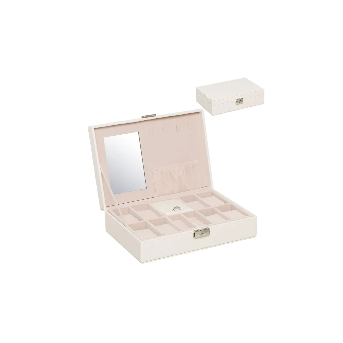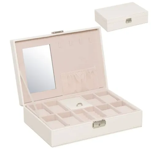 Descubre la elegancia y funcionalidad de nuestra exquisita caja de joyería blanca, diseñada para mantener tus tesoros organizados y al alcance de la mano. Con un espejo interior que añade un toque de sofisticación, esta caja no solo es un accesorio práctico, sino también un elemento decorativo que realza cualquier espacio. Su acabado pulido y su diseño compacto la convierten en la opción perfecta para el almacenamiento de joyas, asegurando que cada pieza brille con su propio esplendor.