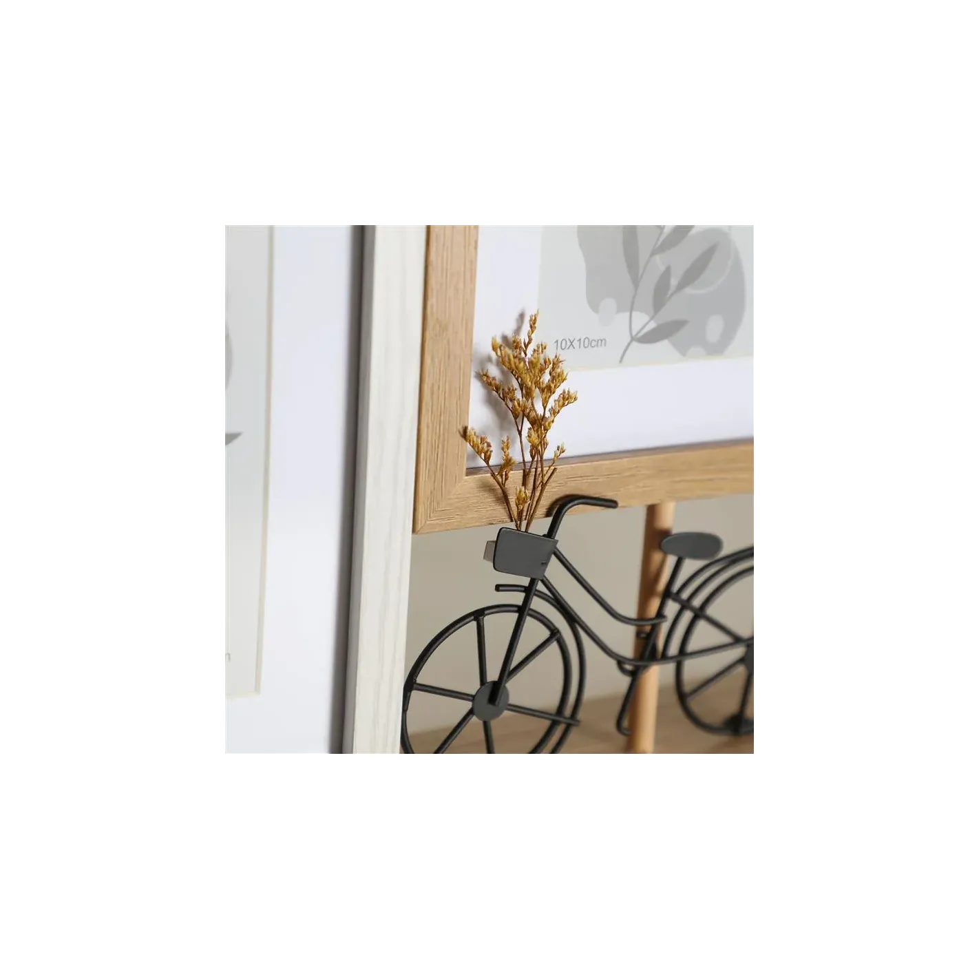 Descubre la elegancia y el estilo de nuestros portafotos, que presentan dos marcos artísticamente diseñados con imágenes de una bicicleta y una planta. Estos portafotos no solo son una forma encantadora de exhibir tus recuerdos más preciados, sino que también añaden un toque de frescura y naturaleza a cualquier espacio. Perfectos para el hogar o la oficina, son ideales para quienes buscan una decoración que inspire y embellezca su entorno.