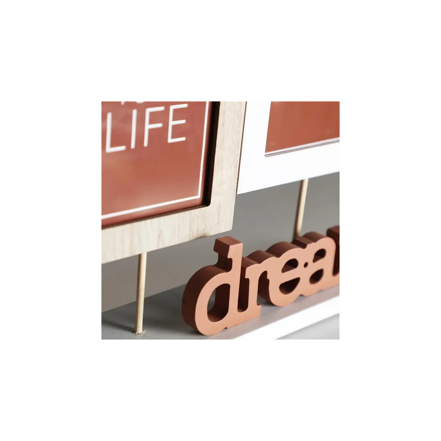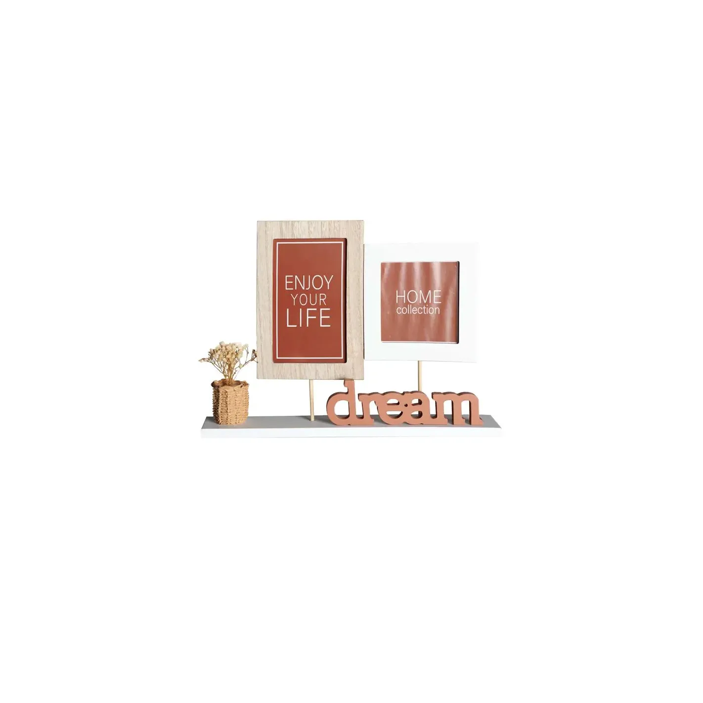 Descubre la elegancia y calidez de nuestro estante de madera, diseñado para realzar cualquier espacio de tu hogar. Este portafotos no solo ofrece un lugar perfecto para exhibir tus recuerdos más preciados, sino que también incluye un encantador letrero que dice "Disfruta tu vida", recordándote la importancia de apreciar cada momento. Ideal para salas de estar, oficinas o dormitorios, este estante combina funcionalidad y estilo, convirtiéndose en un elemento decorativo que inspira felicidad y bienestar.