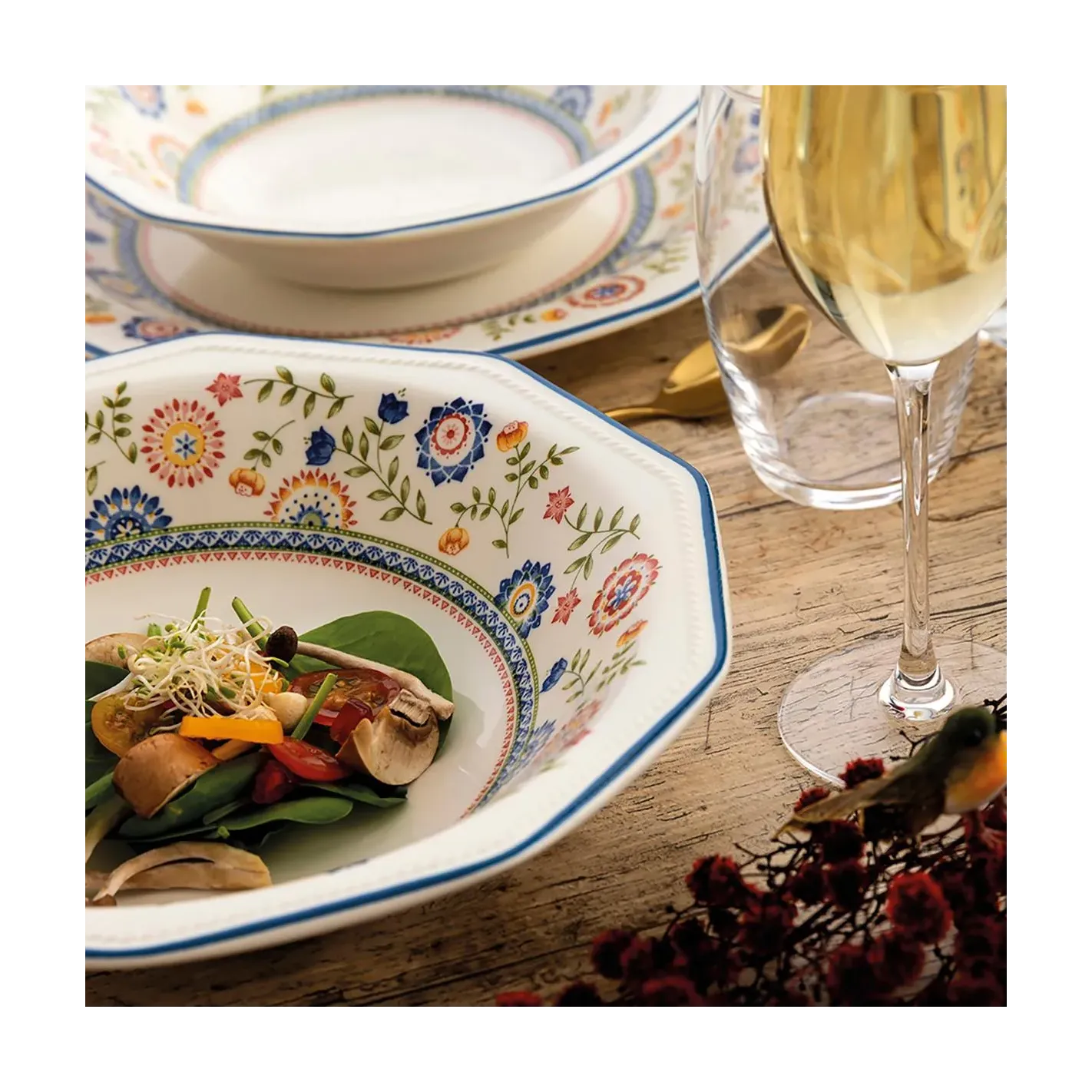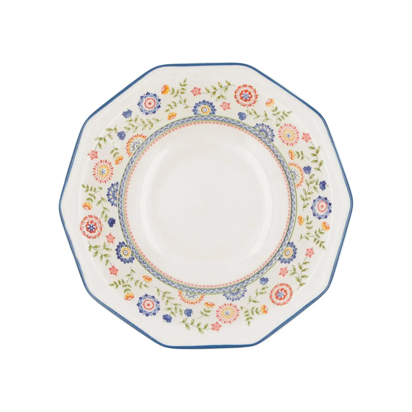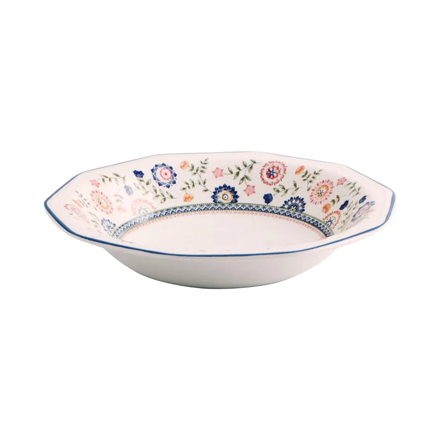 Esta elegante ensaladera blanca con borde azul y delicados diseños florales es la adición perfecta para su mesa. Su diseño sofisticado no solo realza la presentación de sus platillos, sino que también aporta un toque de frescura y estilo a cualquier ocasión. Fabricado con materiales de alta calidad, este tazón es ideal para servir ensaladas, sopas o postres, combinando funcionalidad y estética en cada uso. No pierda la oportunidad de embellecer su hogar con esta pieza única.