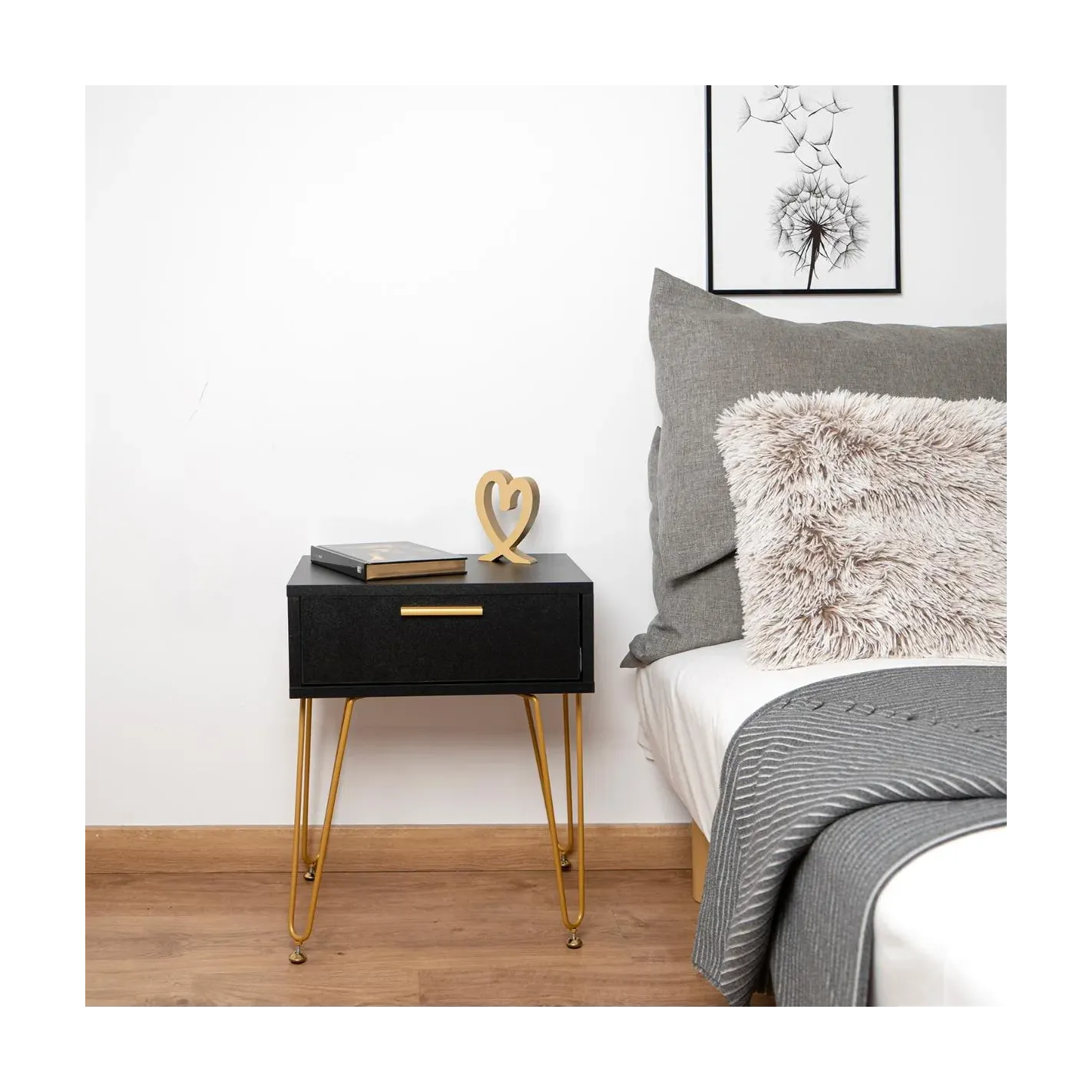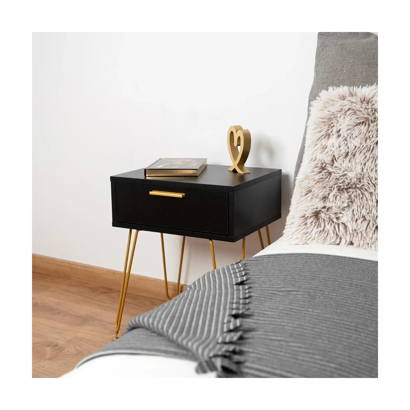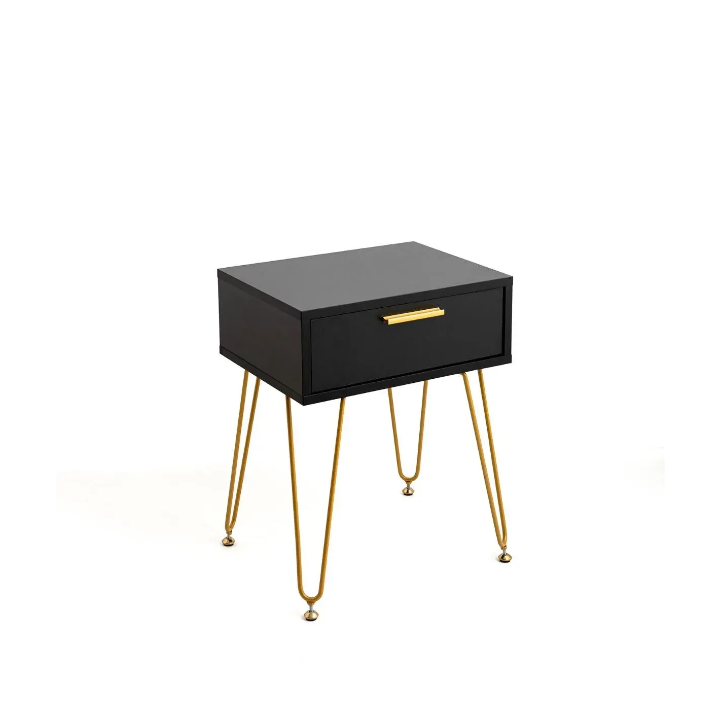 Mesillas elegantes , chic y de última tendencia. Estructura de madera y recubrimiento melamínico negro. Patas en acero pintado en dorado con un acabado especial antioxidación. Cajones forrados con guias metálicas interiores para poder abrirlos con total seguridad. Las guías además le proporcionan una durabilidad extra.