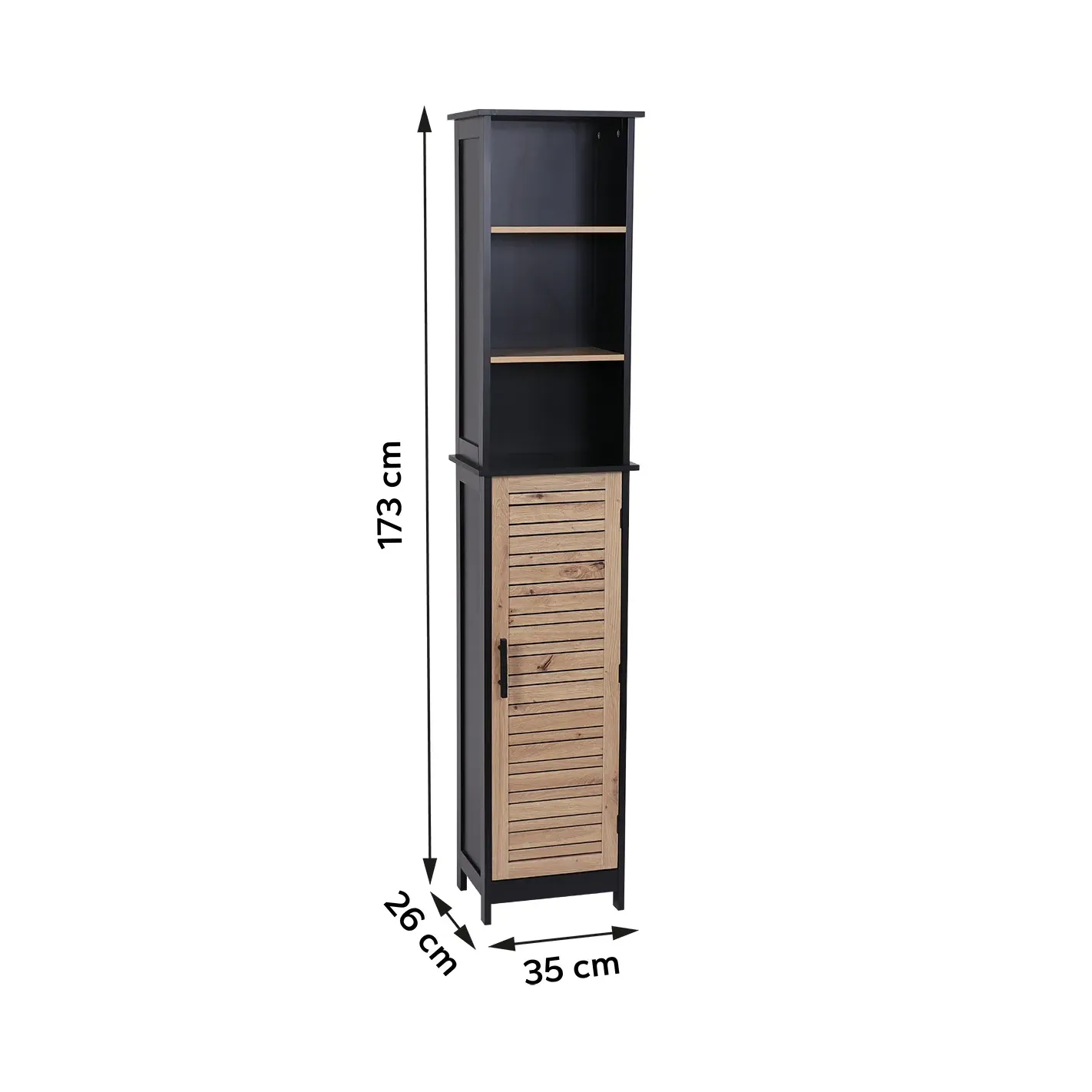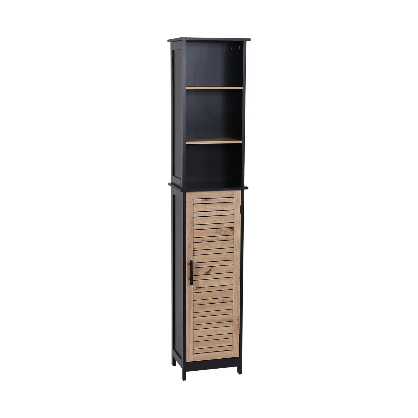 Este elegante armario alto combina un acabado negro moderno con estantes de madera, ofreciendo una solución de almacenamiento tanto funcional como estética. Su diseño vertical maximiza el espacio, ideal para cualquier habitación, desde la sala de estar hasta la oficina. Los estantes ajustables permiten personalizar la disposición según sus necesidades, mientras que la estructura robusta garantiza durabilidad y estabilidad. Añada un toque contemporáneo a su hogar con este armario versátil que se adapta a su estilo de vida.
